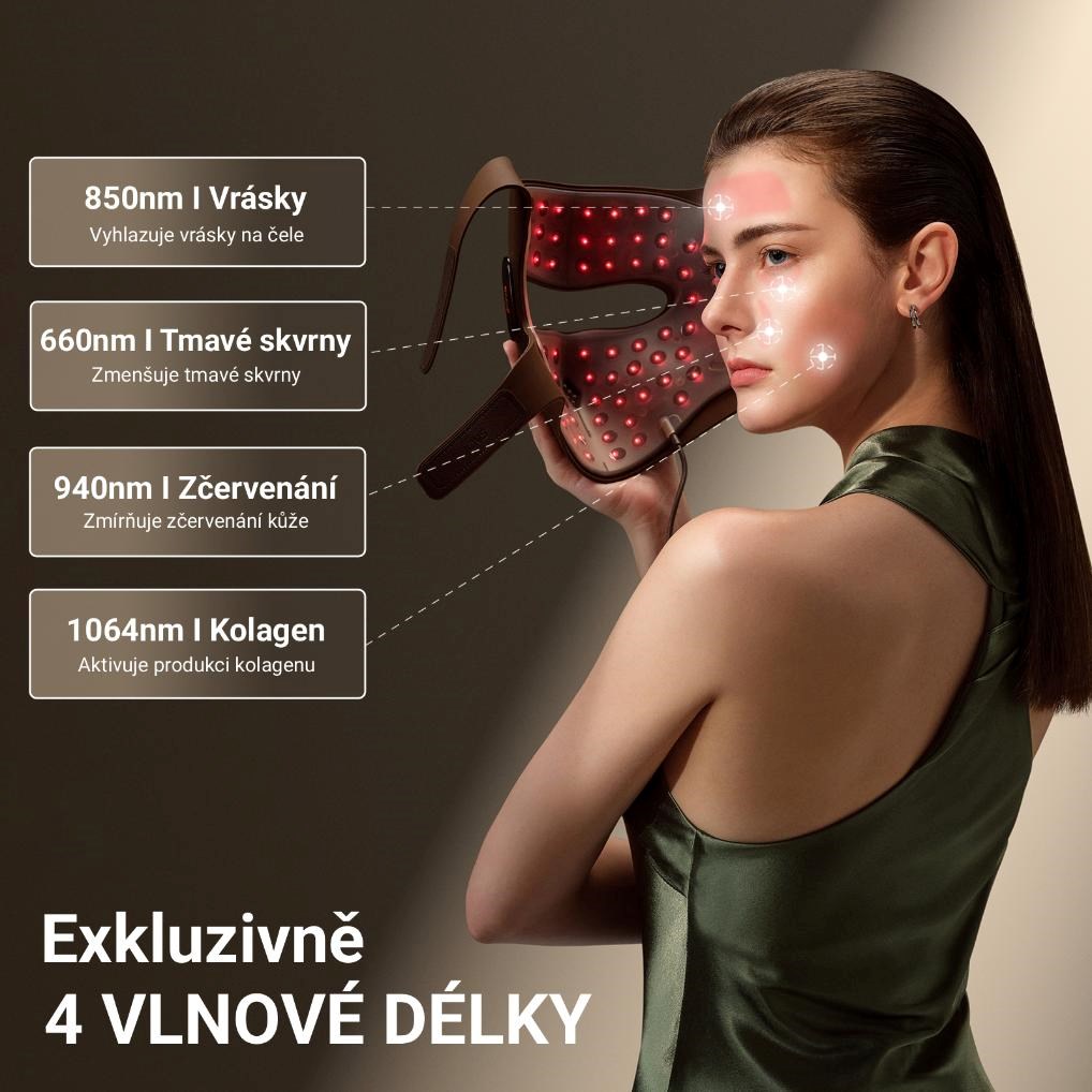 Revoluční 4D laserová technologie – čtyři vlnové délky pro komplexní omlazení pleti 4D v2 Laserová maska Jovs představuje průlom v oblasti domácí laserové terapie díky unikátní kombinaci čtyř dlouhovlnných světel – 660 nm, 850 nm, 940 nm a 1064 nm. Každá z těchto vlnových délek působí v jiné hloubce pokožky a cílí na specifické problémy – od mdlé pleti a tmavých kruhů, přes ztrátu pevnosti až po hluboké vrásky. Klíčová inovace spočívá v použití profesionální vlnové délky 1064 nm, která byla dosud dostupná pouze v klinických laserových přístrojích. Tato technologie proniká hlouběji do dermis, aktivuje produkci kolagenu a podporuje přirozenou regeneraci pleti. Ve srovnání s běžnými LED maskami dosahuje až šestinásobné účinnosti, přináší rychlejší a viditelnější výsledky a umožňuje dosáhnout profesionální úrovně ošetření přímo v pohodlí domova.