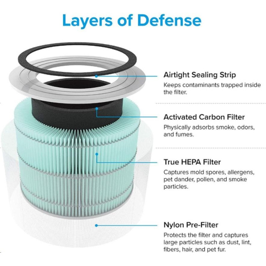 Druhou vrstvou je HEPA filtr H13. To odlišuje Levoit od konkurence, protože filtr HEPA H13 je mnohem kvalitnější a spolehlivější než běžně používané HEPA H11. Tu se odfiltrují jemné prachové částice, plíseň, bakterie, pyl, kouřové částice, roztoče a srst.