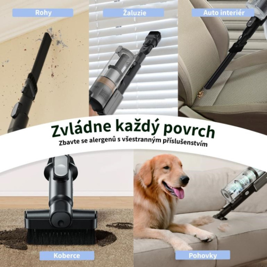 Výkonný tyčový vysavač si poradí se všemi typy povrchů – od tvrdých podlah a koberců až po žaluzie, čalounění i interiér auta. Díky speciálním nástavcům snadno odstraní prach, chlupy i alergeny z těžko dostupných míst. Ideální volba pro důkladný a všestranný úklid celé domácnosti.