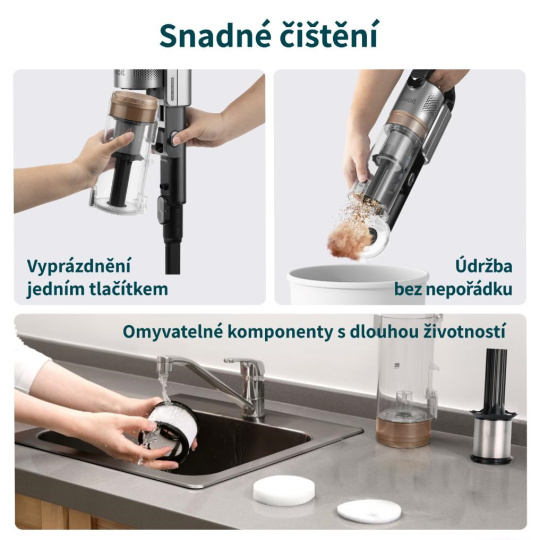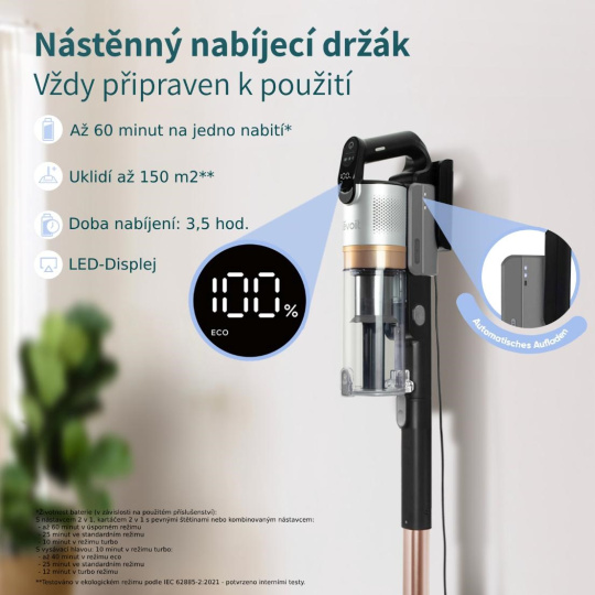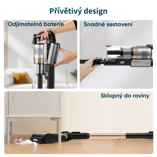 Promyšlený design vysavače usnadňuje každodenní používání – baterii jednoduše odejmete a dobijete samostatně, bez nutnosti manipulace s celým přístrojem. Díky plochému kloubu dosáhnete i pod nízký nábytek, kam se běžný vysavač nedostane. Sestavení a výměna nástavců je otázkou vteřin, takže můžete plynule přecházet mezi různými typy úklidu bez zdržování.