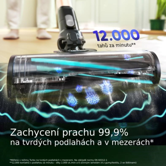 Vysavač je vybavený 240 W bezkartáčovým motorem, který pohání 3000 mAh baterie. Díky kombinaci moderního motoru a velké baterie je vysavač je tak nejen tichý, ale hlavně vydrží pracovat opravdu dlouho. Při běžném úklidu vydrží vysávat až 60 minut, a to stačí na úklid celého prostoru. Kartáč vysavače vyvine až 12.000 kontaktů lamel a kartáče s podlahou za minutu, takže nečistoty nemají šanci.