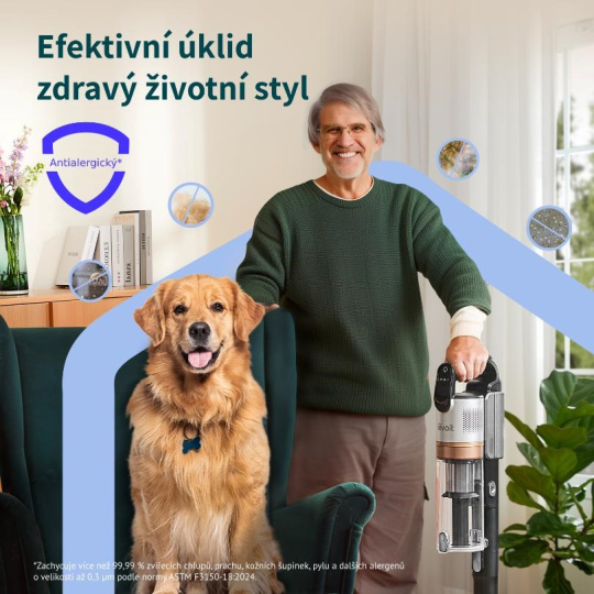 Tyčový vysavač Levoit je navržený, aby maximálně usnadnil úklid vašeho domova, ať už ho sdílíte se čtyřnohým, nebo dvounohým miláčkem. Vysavač je vybaven rotačním kartáčem s kombinací gumových a textilních lamel, který byl navržen tak, aby na něm nedocházelo ke hromadění namotaných vlasů nebo chlupů. Zároveň je ale kartáč efektivní a zachytává maximální množství nečistot. Vysavač pracuje s vyjímatelným akumulátorem s kapacitou 3000 mAh a indikací nabití. Akumulátor lze dobíjet v nástěnné nabíjecí stanici. Motor je s výkonem 240 W nezvykle tichý, při běžném provozu vydává 77,5 dB, v Turbo režimu pak 83,5 dB. Vysavač s plně nabitou baterií dokáže pracovat až 60 minut, což umožní úklid celého obydlí na jedno nabití. Úklid s LVAC 300 je radost díky jeho velmi nízké hmotnosti 1,6 kg. Díky tomu je snadné s vysavačem odstranit i pavučiny ze stropu, prach ze žaluzií nebo nečistoty pod nábytkem. V balení naleznete dlouhou a krátkou násadu, rotační kartáč, 2v1 štěrbinovou hubici, 2v1 hubici na silně znečištěné povrchy a zvířecí srst a 2v1 kombinovanou hubici s kartáčem. Tím máte perfektní sadu nástrojů pro kompletní úklid. Levoit LVAC si hravě poradí se všemi povrchy, ať už jsou to koberce, tvrdé podlahy nebo čalounění. Kartáčový nástavec je navíc vybavený LED světlem, takže umožní práci v tmavých zákoutích, a navíc osvětluje přítomné nečistoty. Vysavač v sobě skrývá 5násobný HEPA filtrační systém, který odstraní 99,99 % částic od velikosti 0,3 mikrometrů – snadno se vypořádá s prachem, pylem, roztoči, zbytky zvířecí kůže a chlupů. Nečistoty se shromažďují v 0,75L nádobě s mechanizmem pro snadné a hygienické vyprazdňování. Filtry i kartáč jsou jednoduše vyjímatelné a omyvatelné.