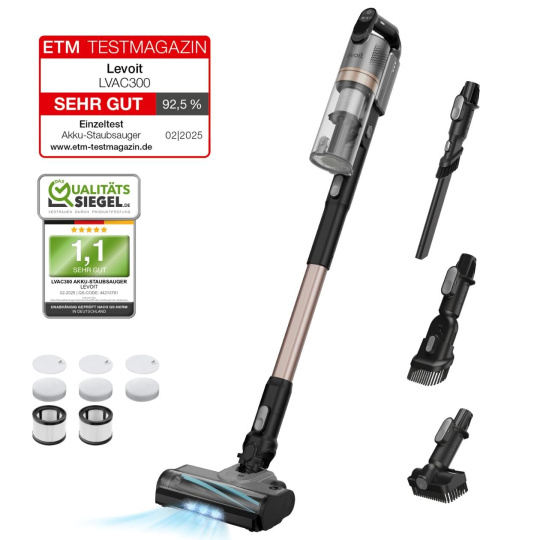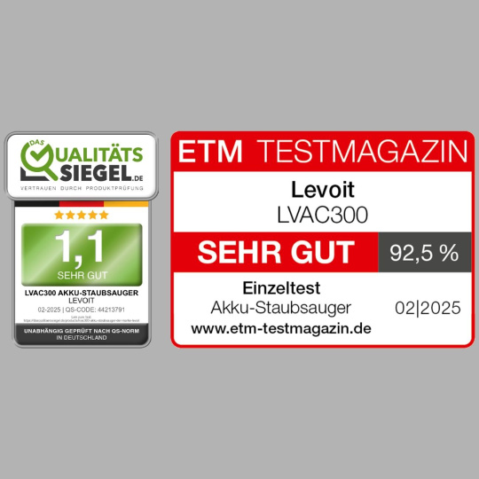 V nezávislém testu německého ETM Testmagazin dosáhl Levoit LVAC-300 vysokého hodnocení 92,5 % a známky SEHR GUT. V testu byla například naměřena ještě nižší hlučnost, než udává výrobce, a to ve všech režimech. V režimu ECO dokonce 68,9 dB. Dále vysavač získal hodnocení 1,1 v dalším německém testu, Qualitaets Siegel.