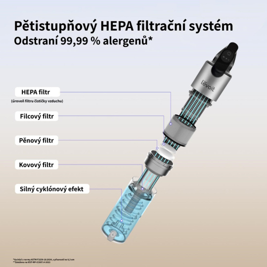 Vysavač Levoit LVAC300 filtruje nečistoty v pěti stupních a na konci je vybavený HEPA filtrem se záchytem 99,99 % částic nad 3 mikrony. Snadno si poradí s běžnými alergeny jako je zvířecí srst a zbytky kůže, prachy, pyl a roztoči.