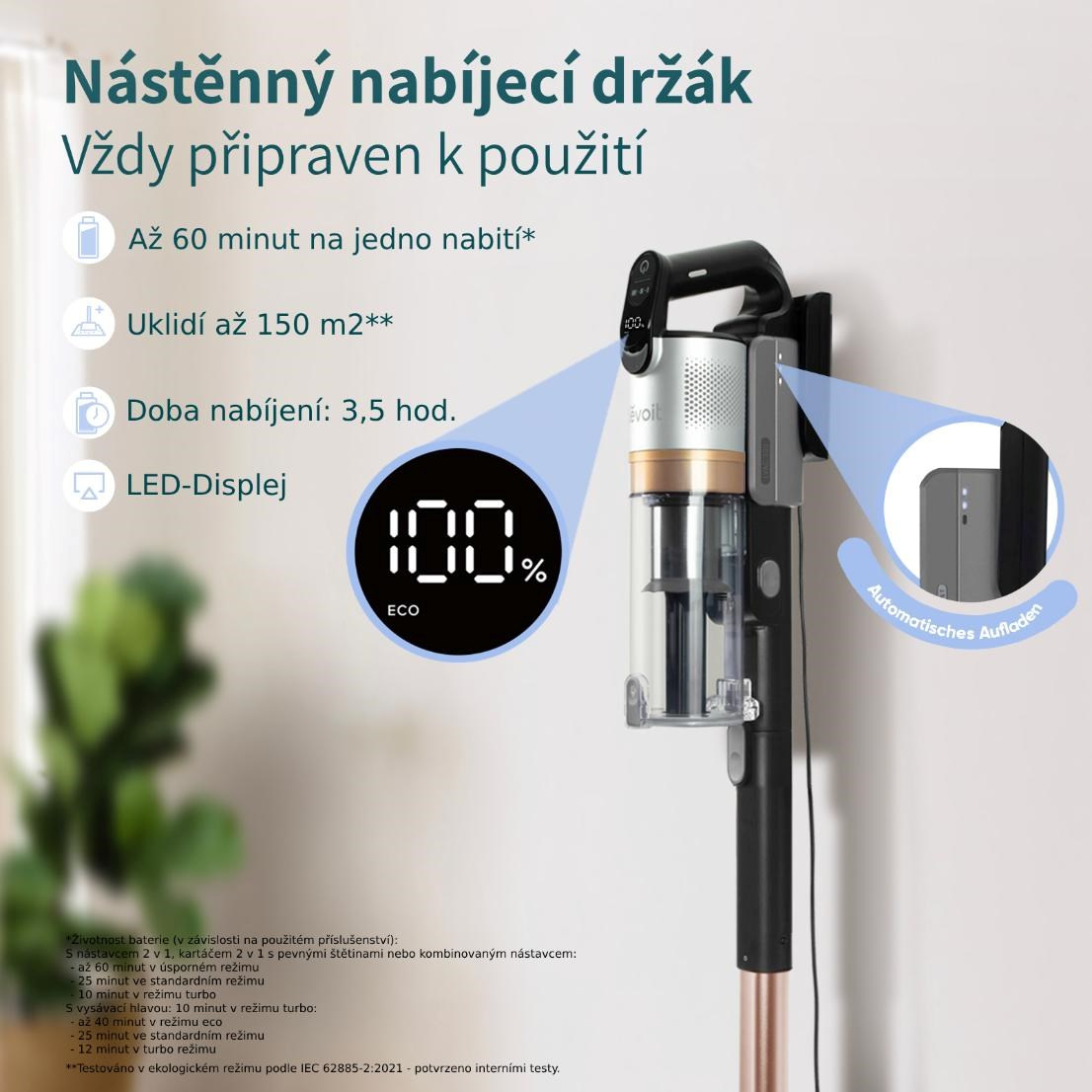 • 3 režimy, ECO pro maximální výdrž, MID pro standardní úklid a Turbo pro maximální výkon