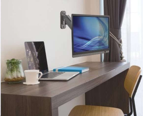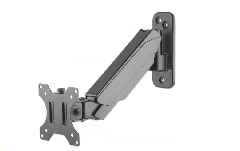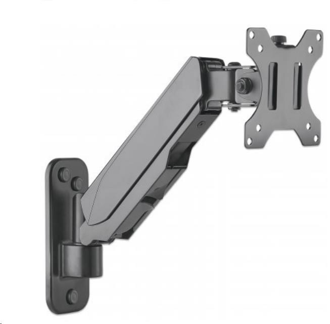 The Manhattan Universal Gas Spring Monitor Wall Mount offers a single-jointed gas-spring arm to securely hold one 17" to 32" TV or monitor. This mount's gas spring promotes easy movement of the monitor or TV to a more comfortable viewing angle with the lightest touch. Designed to be installed on the wall to give back much-needed desktop real estate, the Manhattan Universal Gas Spring Monitor Wall Mount provides more flexibility, reach, and overall enjoyment of whatever task is at hand.