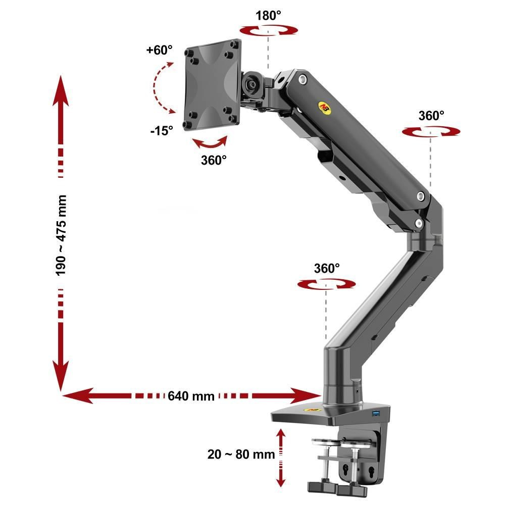 Držák na monitor Tv NB G50 Profesionální stolní držák na širokoúhlý monitor nebo All in One Pc 27-45", otočný +/-180°, sklopný +60°/-15°, nastavitelná výška od stolu 190-475mm, nastavitelná vzdálenost 0-640mm, 1x port USB, 2 typy stolních úchytů, systém vedení kabeláže, VESA stndardy 75x75 a 100x100, nosnost 16kg Jeden z nejkvalitnějších stolních držáků pro zavěšení širokoúhlých monitorů nebo All in One PC - profesionální, poctivá konstrukce, dizajn propracovaný do detailu a velmi snadné polohování. Držák doporučujeme i náročným zákazníkům, do vytížených provozů, kanceláří nebo showroomů. Své uplatnění najde na každém stole. Držák je ideální na širokoúhlé i klasické monitory, All in One Pc nebo televizory s úhlopříčkou 27-45", u širokoúhlých monitorů může být úhlopříčka i větší. Podmínkou je hmotnost v rozmezí 5-16kg, u lehčích obrazovek nebude možné výškové polohování. Držák podporuje VESA 75x75 a 100x100, v případě potřeby nabízíme i rozšíření na 200x100, 100x200 a 200x200. Kompletní polohovatelnost: otáčení +/-180°, naklápění +60°/-15°, snadné nastavení výšky díky plynovému pístu od 195mm až do 475mm, nastavení vzdálenosti od úchytu 0-640mm, funkce pivot, port USB, propracované vedení kabeláže, 2 typy stolních úchytů. Profesionální stolní držák na širokoúhlé monitory a All in One Pc NB G50 Technické údaje: minimální hmotnost monitoru nebo Tv 5kg maximální hmotnost monitoru nebo Tv 16kg podporuje VESA standardy 75x75 a 100x100 doporučená úhlopříčka monitoru Tv 27" až 45" ideální na širokoúhlé monitory, zobrazovací zařízení, All in One Pc nebo televizory otáčení do stran +/- 180° naklápění +60° / -15° nastavení výšky od stolové desky 195mm až 475mm výškové polohování 280mm nastavení vzdálenosti od stolního uchycení 0-640mm funkce pivot - horizontální nebo vertikální otočení obrazovky 1x port USB na základně držáku systém vedení kabeláže 2 typy stolních úchytů (na okraj nebo přes otvor do prostoru) barevné provedení černé záruka 5 let Profesionální stolní držák na širokoúhlý monitor NB G50 Stolní držák na širokoúhlé monitory Tv NB G50 podporuje VESA standardy: VESA 75x75 VESA 100x100.