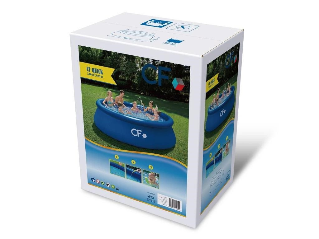 Připravte se na teplé počasí a nekonečné hodiny vodních radovánek na vlastním zahradě se samonosným nadzemním bazénem CF QUICK. Tento nadzemní bazén v modré barvě je navržen pro jednoduchou montáž a může být připraven během několika minut. Stačí jen připravit to správné místo na bazén, rozvinout bazénovou podložku, rozbalit bazén, nafouknout prstenec a napustit vodu. Stoupající voda bazén sama postaví. Tento nadzemní kruhový bazén s průměrem 366 cm je ideální pro celou rodinu a díky absenci pevných prvků je vhodný i pro menší děti (děti musí zůstat pod dohledem dospělé osoby). Bazén je vyroben z odolných a super pevných PVC materiálů, aby bylo zajištěno, že zůstane stát i přes veškerou zábavu, kterou tento bazén nabízí.