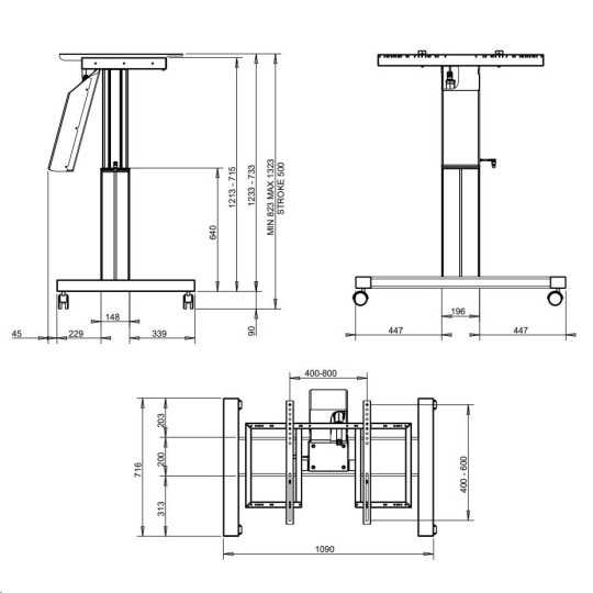 Stojan na televize i monitory, který má plně motorizované nastavení výšky i náklonu obrazovky, ovládání pomocí ovládacího panelu. Kdykoliv můžete změnit výšku obrazovky v rozmezí od 788mm až do 1288mm (výška od podlahy po střed obrazovky) a náklon obrazovky od 0° (obrazovka je svisle) až do 90° (obrazovka je vodorovně) jednoduše a rychle pouhým stiskem tlačítka na dálkovém ovládání. Konstrukce Tv stojanu je profesionální kvality, zavěsit je možné televizory a monitory s hmotností až 150kg.