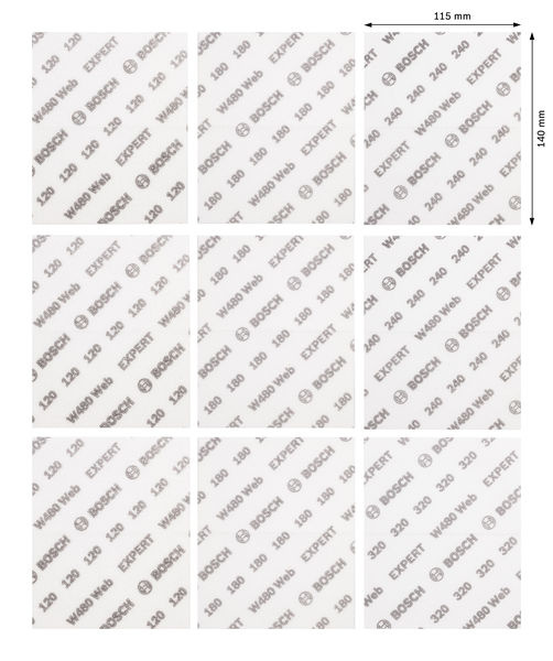 Bosch sada ručních brusných sítí EXPERT W480 Web 1/4, 115 × 140 mm, G120 (3×); G180 (3×); G240 (2×); G320 (1×), 9 ks