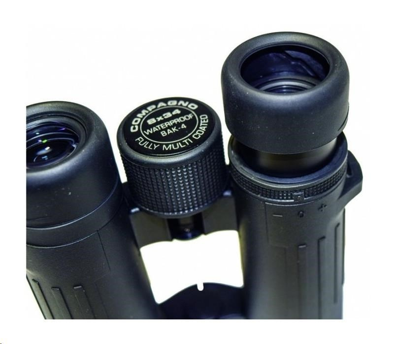 Dalekohled kompaktní COMPAGNO 10x34, zvětšení 10x, přední čočka 34mm, zorné pole 106m, ostré od 4m, optický výstup 3,3mm, vzdálenost středu očí 56-74mm s odstupem 16,0mm, světelnost 10,9, stmívání 18,4, rozměry 130x126x45 mm, hmotnost 450g, černý. Dalekohledy kompaktní DCF se střechovými hranoly BaK4 - ROOF (DACH). Modelová řada s moderním designem, malými rozměry, nízkou hmotností a vysokou optickou kvalitou pro kontrastní pohled i při zhoršených světelných podmínkách. Výkonný a odolný dalekohled s Fully Multicoated úpravou, hranoly z BaK4 skla, voděodolný do 0,5m/15min s ochranou proti zamlžení plněním Dusíkem, vhodné i pro sledování s brýlemi, nastavení +/-4 dioptrie, výsuvné krytky okuláru, stativový závit, pogumováné tělo z ABS. Včetně textilního pouzdra, popruhu a čistícího hadříku. Malý ale maximálně výkonný dalekohled do kapsy pro turistiku..