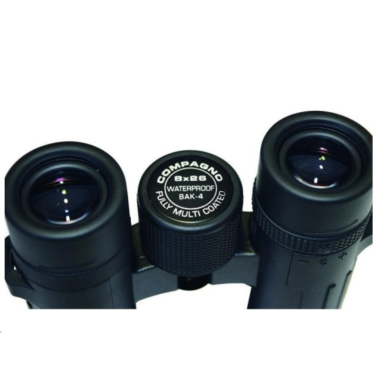 Dalekohled kompaktní COMPAGNO 8x26, zvětšení 8x, přední čočka 26mm, zorné pole 118,6m, ostré od 4m, optický výstup 3,2mm, vzdálenost středu očí 56-74mm s odstupem 16mm, světelnost 10,6, stmívání 14,4, rozměry 117x115x40 mm, hmotnost 325g, černý. Dalekohledy kompaktní DCF se střechovými hranoly BaK4 - ROOF (DACH). Modelová řada s moderním designem, malými rozměry, nízkou hmotností a vysokou optickou kvalitou pro kontrastní pohled i při zhoršených světelných podmínkách. Výkonný a odolný dalekohled s Fully Multicoated úpravou, voděodolný do 0,5m/15min s ochranou proti zamlžení plněním Dusíkem, vhodné i pro sledování s brýlemi, nastavení +/-4 dioptrie, výsuvné krytky okuláru, stativový závit, pogumováné tělo z ABS. Včetně textilního pouzdra, popruhu a čistícího hadříku. Malý ale maximálně výkonný dalekohled do kapsy pro turistiku..