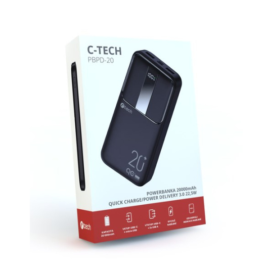 C-TECH Powerbanka 20000mAh, Li-Pol, 22,5W, USB-C/USB-A/micro USB