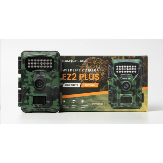 EZ2 Plus – The Advanced Wildlife Camera Specifications: Color: Camouflage Photo Resolution: 24 Megapixel Video Resolution: Full-HD (1080p) Detection Distance: 20 meters Trigger Speed: 0.3 seconds Number of IR LEDs: 42 Viewing Angle: 90 degrees Detection Angle: 120 degrees Infrared Type: 940NM No Glow Maximum Memory: 64... více