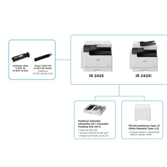 | Přídavný podavač papíru AK1 | Kapacita papíru: 1× 250 listů (80 g/m2) Typ papíru: běžný, recyklovaný, barevný, děrovaný Velikost papíru: A3, A4, A4R, A5, B4, B5, B5R Gramáž papíru: 64 až 90 g/m2 Zdroj napájení: z hlavní jednotky Rozměry (Š × H × V): 581 × 575 × 92 mm Hmotnost: přibližně 5,8 kg |