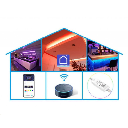 LED pás Carneo Smartlight RGBW Wifi je 5m dlouhý flexibilní samolepící pás, osazený celkem 240ks LED diod s plnobarevným světelným spektrem RGB a teplým bílým světlem. Barvu a intenzitu světla si můžete regulovat buď pomocí mobilní aplikace SmartLife nebo pomocí systémů inteligentního ovládání domácnosti Amazon Alexa nebo Google Home. Aplikace je kompatibilní se zařízeními Android ve verzi 4.0 a vyšší a také se zařízeními iOS ve verzi 8.1 a vyšší. Led pás se ovládá pomocí technologie WIFI, proto je třeba jej připojit do vaší domácí Wifi sítě.