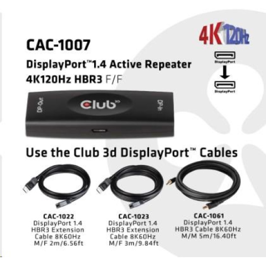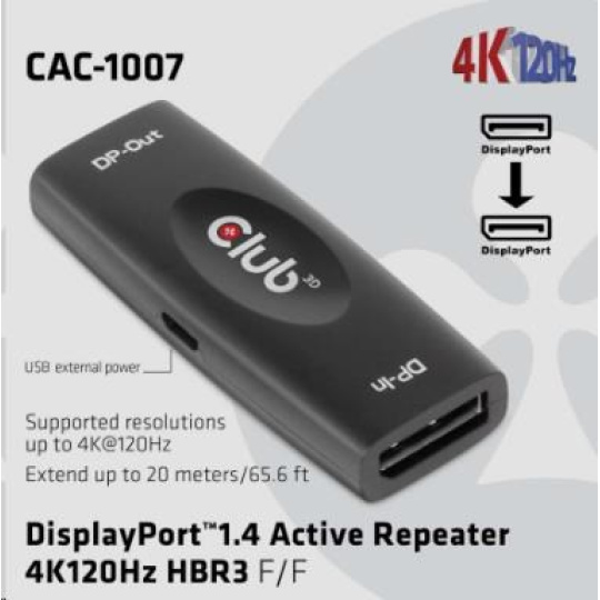 | Product Name: DisplayPort™ 1.4 Active Repeater 4K120Hz HBR3 F/F Product Series: Adapter Itemcode: CAC-1007 EAN code: 8719214471590 UPC code: 841615101788Product Name: DisplayPort™ 1.4 Active Repeater 4K120Hz HBR3 F/F |