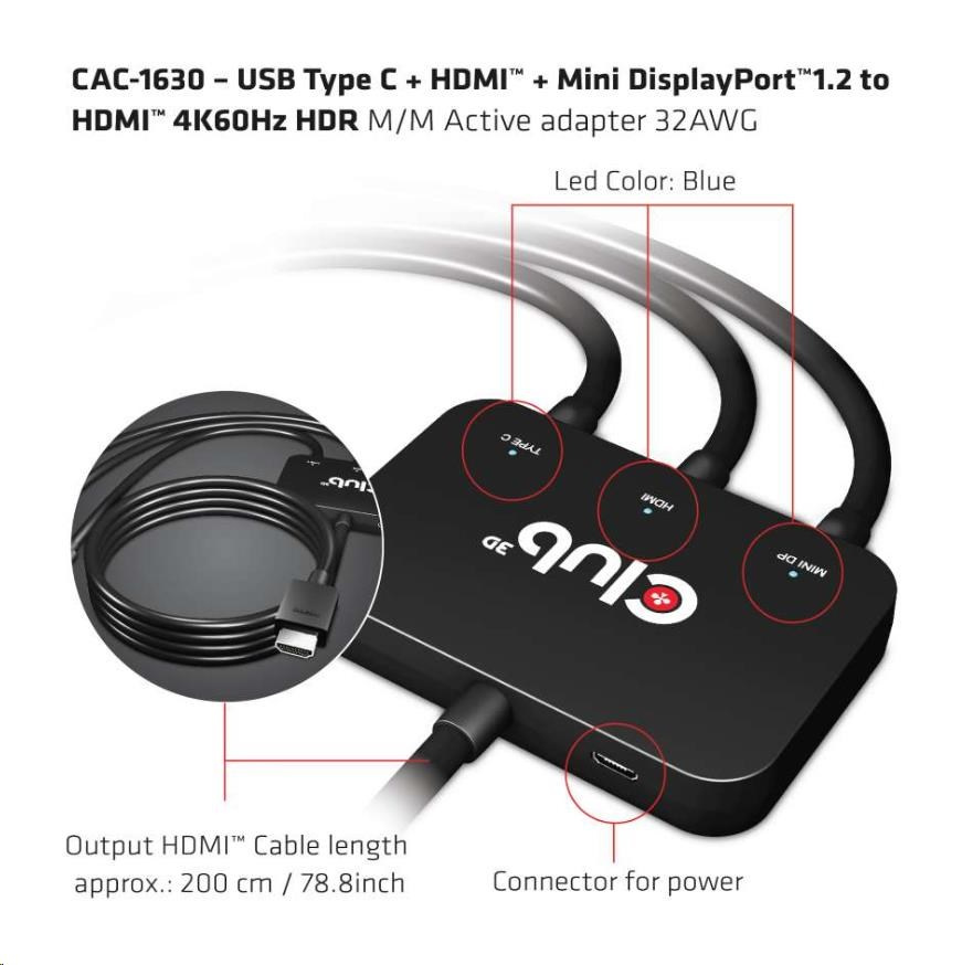 Club3D adaptér aktivní USB Type-C + Mini DP 1.2 + HDMI na HDMI 4K60Hz HDR, M/M, 32AWG