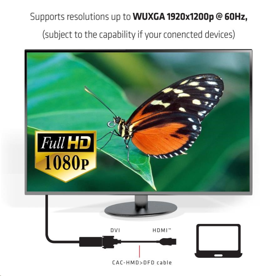 Club 3D CAC-HMD> DFD je převodník signálu HDMI ™ na DVI. Tento adaptér je nejjednodušší řešení pro připojení stolního počítače / notebooku / tabletu, který obsahuje rozhraní HDMI ™, k monitoru, projektoru nebo televizi s rozhraním DVI. Adaptér využívá prémiové komponenty pro zajištění nejvyššího kvality přenosu signálu a zároveň snadného použítí, což vede ke skvělému uživatelskému zážitku.