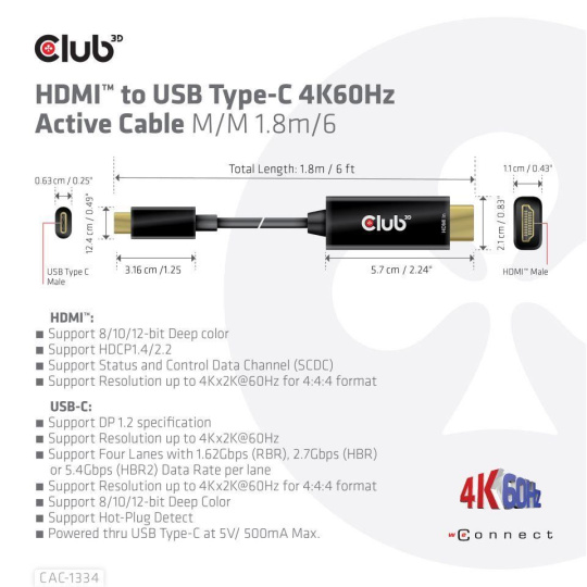 The Club 3D CAC-1334 is a HDMI™ to USB-C Active Cable which allows you to transmit signal from HDMI™ source (Laptop, tablet, PC etc.) to USB-C display devices(TV, monitor, projector, etc.). This cable is Uni-Directional it only works from an HDMI™ Source device to an USB C DP™ 1.2 Alternate mode supported display. This product supports DP™1.2 specification with resolution up to 4096 x 2160@60Hz.