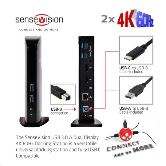 CSV-1460 - The SenseVision USB 3.1 Gen 1 Dual Display 4K 60Hz Docking Station is designed to satisfy all your connectivity demands. It provides no less than 6 USB 3.1 Gen 1 Ports, Headphone connection, Microphone connection, Gigabit Ethernet port and 2 x Displayport™ outputs.