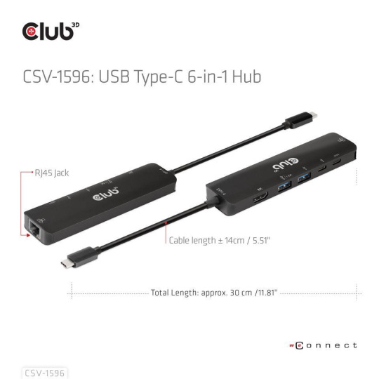 The Club 3D CSV-1596 is a USB Gen1 Type-C, 6-in-1 Hub with HDMI™8K30Hz, 2xUSB Type-A, RJ45 and 2xUSB Type-C, Data and PD charging 100 watt, providing an ideal solution for extending the port of Type-C/Thunderbolt host (PC/Laptop/Mobile phone,etc.), especially for those host with a single Type-C port. This hub adopts the latest DP1.4 Alt mode supported IC, enabling to output HDMI™ video with max. 8K30Hz and at the meanwhile transfer USB 3.1 data with max 5Gbps. The USB Type-A and Type-C data ports allow you to connect 4 USB devices simultaneously. 1 Gigabit Ethernet for super fast Ethernet. Besides, the Type-C female supports PD 3.0 PD Charging 100W (15W is dedicated to the functioning of this product, the rest power(max 85W) will be passed to charge for the host. This 6-in-1 Hub will work on all DP Alt mode supported Type-C hosts.