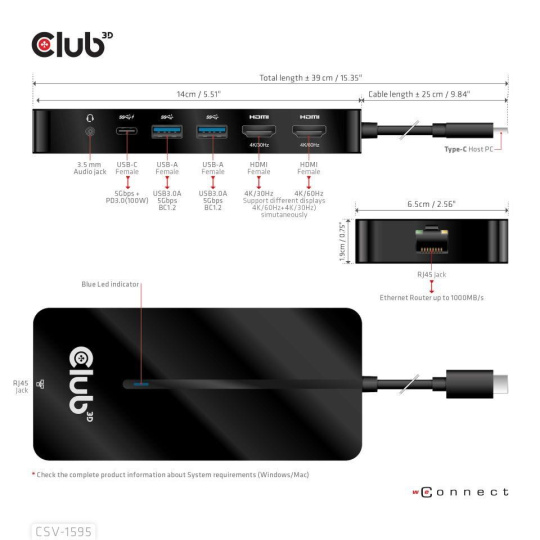The Club 3D CSV-1595 USB Gen1 Type-C 7-in-1 hub with with 2x HDMI™, 2x USB Gen1 Type-A, 1x RJ45, 1x 3.5mm Audio, 1x USB Gen1 Type-C 100W Female port, provides a very advanced, efficient solution to extend a single USB Gen1 Type-C port to multiple ports. It integrates video, data and power ports that allows to connect 2 displays simultaneously for enjoying videos on a larger screen, connect multiple USB Gen1 devices for data transmission up to 5Gbps, connect a Gigabit Ethernet source for getting your PC connected to super high speed network, or connect to headset to enjoy fantastic music. It also provides PD charging for support up to max. 100W PD charging. This is for operating this device and charge the host simultaneously. It can work on all DP™1.4 Alt mode supported USB Gen1 Type-C hosts.