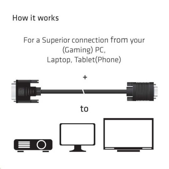 Please use one of our VGA / DVI (Extension/Adapter) cables to connect to your devices: In case you need assistance to choose the correct cable, please visit our website www.club-3d.com or feel free to mail us at support@club-3d.com and it will be our pleasure to assist you.