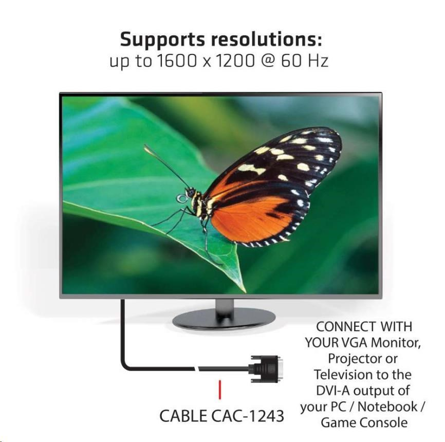 The Club 3D CAC-1243 is a DVI-A Male to VGA Male Cable. This cable is Unidirectional. This CAC-1243 Cable is the easiest solution for connecting your VGA Monitor, Projector or Television to the DVI-A output of your PC / Notebook / Game Console.