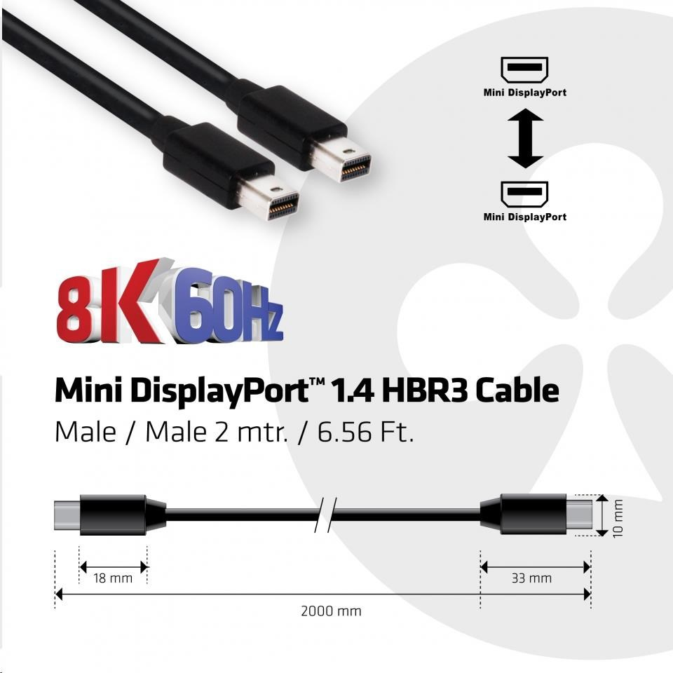 Club-3D MINI DISPLAY PORT 1.4 MALE TO MINIDISPLAY PORT MALE CABLE 2 METERS / 6.5FEET 8K@60HZ BI-DIRECTIONAL