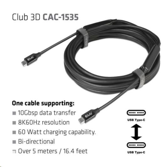 The Club 3D CAC-1535 is an USB Type C to USB Type C Bi-directional Active Cable with a Re-timer chipset for enhancing Video, Data and Power that reaches up to 5 meters / 16.40ft . For video its compatible with DP1.4 standards with a theoretical resolution of up to 8K@60Hz. For data it is compatible with USB3.2 Gen 2 with a maximum of 10Gbps of data transmission and for power it is capable of delivering a max of 60W (20V/3A) PD Charging.