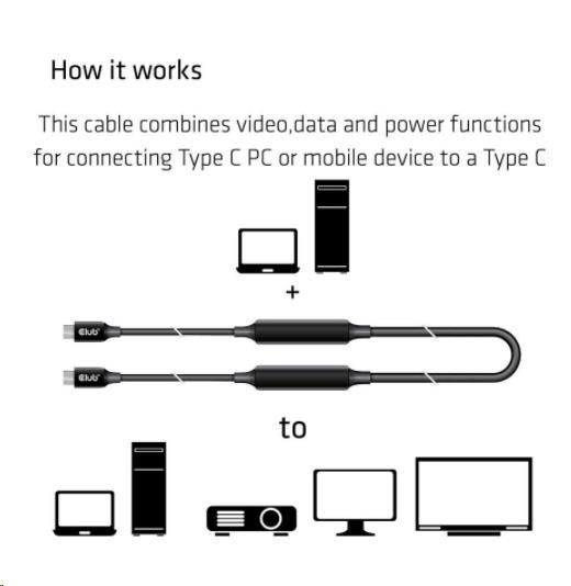 This cable combines video,data and power functions for connecting USB Type C PC or mobile device to a USB Type C display/VR/HardDrive/
