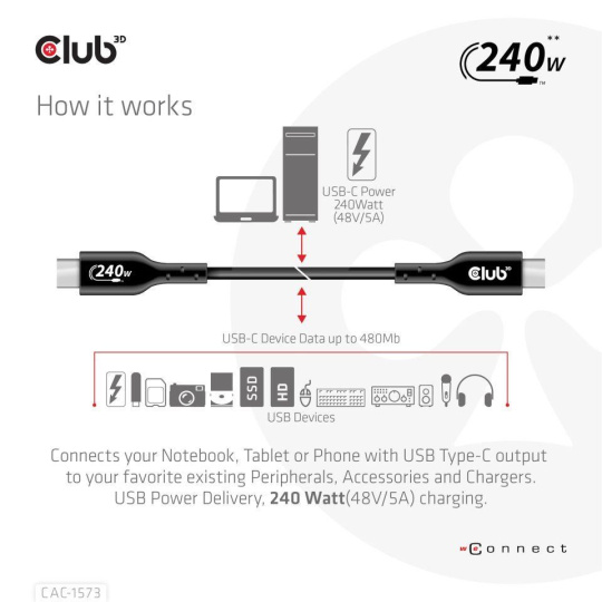 The Club 3D CAC-1573 USB2.0 Type-C Bi-Directional Cable, Data 480Mb, PD 240W(48V/5A) EPR, Extended Power Range M/M 2m/6.56ft connects your Notebook, Tablet or Phone with USB Type-C output to your favorite existing Peripherals, Accessories and Chargers. It enables Data and Power over a single cable and both ways. This cable supports USB2.0 data up to 480Mbps and up to 240Watt(48V/5A) output for Downstream charging or powering your Notebook, Tablet or Smartphone.