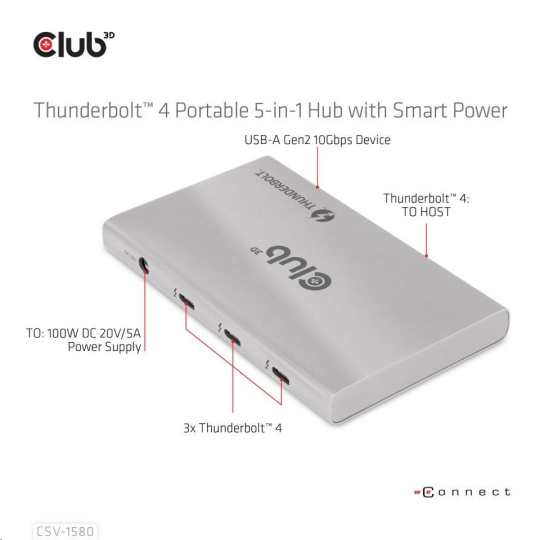 The Club 3D CSV-1580 is a Certified Thunderbolt™ 4 portable Hub which provides the most advanced, efficient, and versatile I/O solution available with up to 40Gb/s for data and video. For the first time this Thunderbolt™ 4 modern Hub has 3 Thunderbolt™ 4 downstream ports that allow you to cascade Thunderbolt™ 4 devices to one 8K30Hz or two 4K60Hz monitors, it can also easily connect to any USB Type-C device, all while simultaneously charging the PC. Besides, it supports Smart Power function which enables to distribute power according to the power consumption of the connected device, making full use of external power supply. It is designed for Thunderbolt™ 4 based PCs and Thunderbolt™ 3 based Macs™ utilizing MacOS™ 11 and later versions.