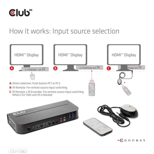 | In the box | • CSV-1382 HDMI™ KVM Switch x 1 • External Power Supply 5V 3A x 1 • IR Remote Control x1 • IR Extender x1 • USB Type B Male to USB A Male cable x2 • Quick Installation Guide |