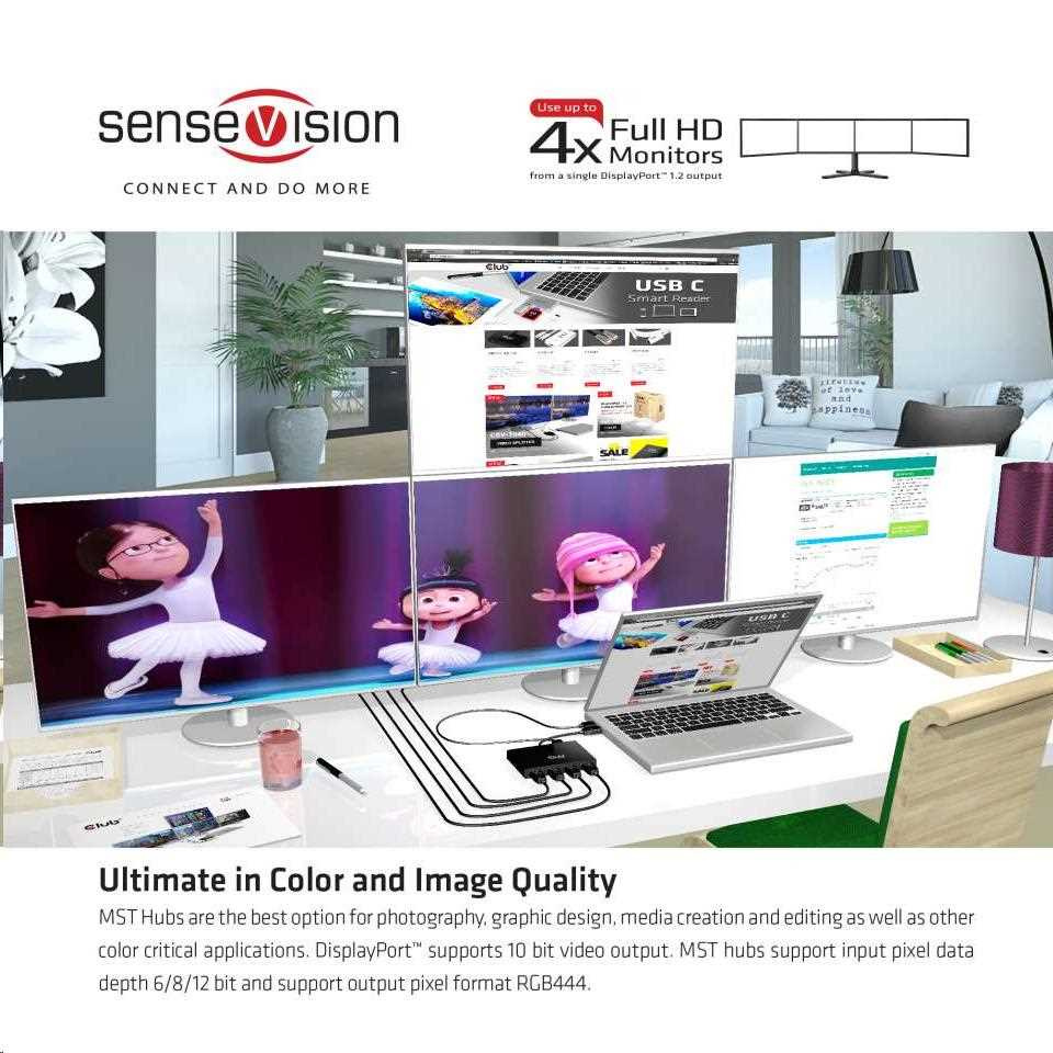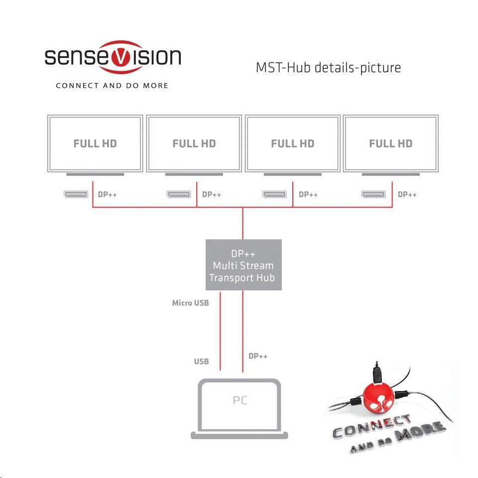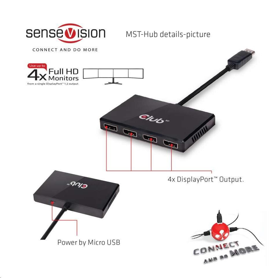 Rozbočovače Club 3D SenseVision MST využívají technologii Multi Stream Transport, jedinečnou funkci DisplayPort ™ 1.2, která umožňuje přenášet více nezávislých nekomprimovaných video (a audio) toků na jediném kabelu. To umožňuje použití více monitorů připojených pomocí rozbočovače MST. Rozbočovače Club3D MST jsou schopny distribuovat tyto video toky na připojené obrazovky.