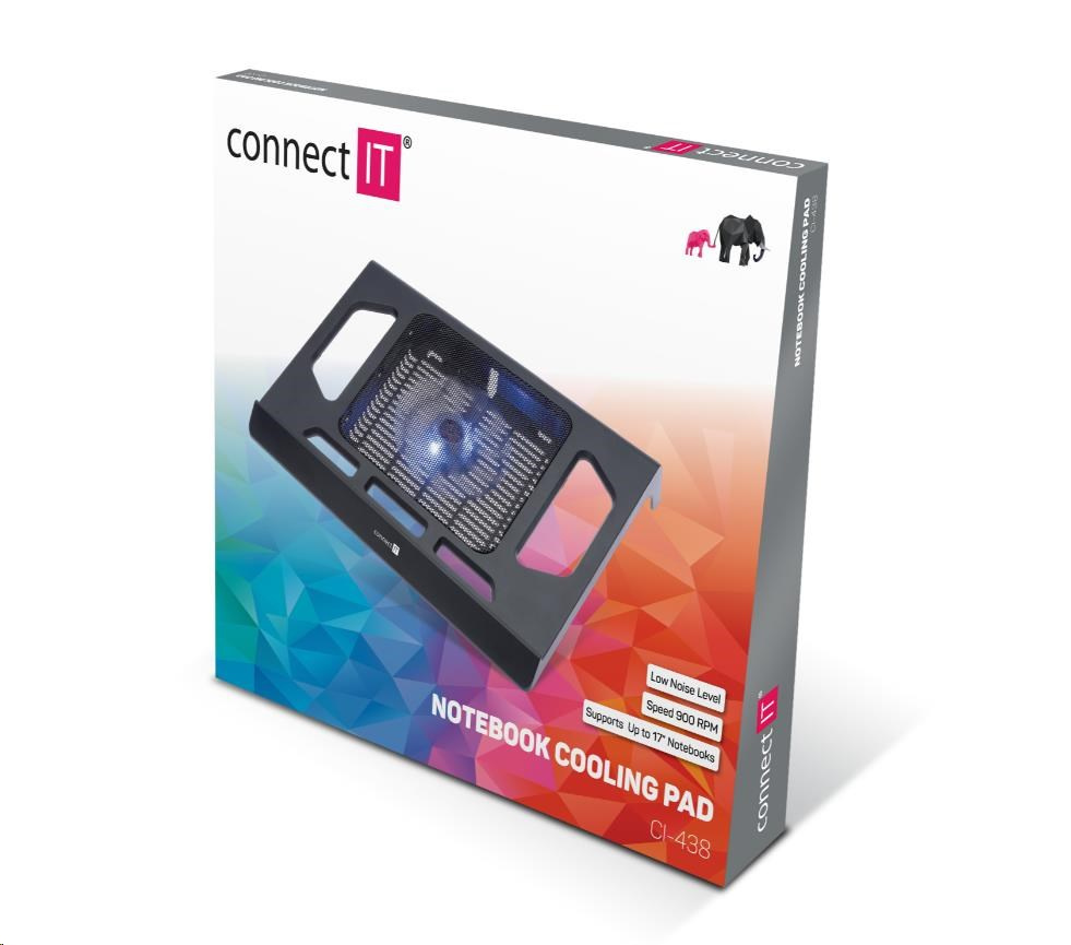 Chladící podložka pod notebook Breeze Technické specifikace: VENTILÁTOR: Průměr ventilátoru: 13cm s LED modrým podsvícením Rychlost: 900 + -10% (RPM) Hlučnost: 23 dBA Průtok vzduchu: 42 CFM Napájení: Port USB (5V DC) Spotřeba: 1.75W DESIGN: Barva: černá Materiál: plast + kov Kompatibilita: až 17" notebooky Rozměry: (Š x V x H) 295 * 350 * 50mm Hmotnost: 380 g.