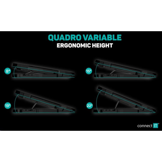 Podložka zajišťuje jak odvod tepla z notebooku a jeho ventilačních otvorů, tak i přímé ochlazování pláště notebooku díky cirkulaci chladného vzduchu a celkově tak zvyšuje výkon notebooku. Je plně kompatibilní s notebooky až do velikosti 15,6" a díky kompaktním rozměrům je předurčena jak pro práci doma a v kanceláři, tak i pro cestování a časté přenášení. Ultratichý chod 4 ventilátorů vás nebude rušit ani při nejnáročnější práci vyžadující maximální soustředění. Výšková polohovatelnost ve 4 různých stupních vám zajišťuje maximální pohodlí i při delších pracovních či herních sezeních.