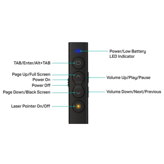 | Funkce prezentéru | - TAB/ENTER/ALT+TAB - PAGE UP/FULL SCREEN - PAGE DOWN/BLACK SCREEN - VOLUME UP/PLAY/PAUSE - VOLUME DOWN/NEXT/PREVIOUS |