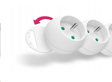 Díky pootočení zásuvek o 45° je možné používat i objemnější napájecí adaptéry nebo úhlové koncovky. Výsuvné očko v horní části zásuvkového modulu umožňuje zavěšení nebo pevnou instalaci na stěnu (s výhodou využijete např. v dílnách a garážích).