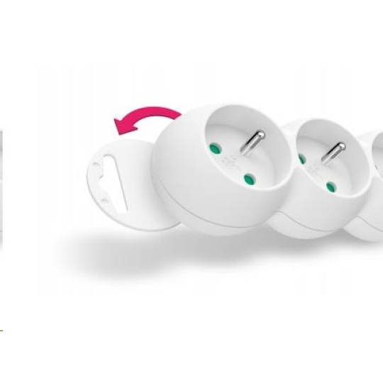 Díky pootočení zásuvek o 45° je možné používat i objemnější napájecí adaptéry nebo úhlové koncovky. Výsuvné očko v horní části zásuvkového modulu umožňuje zavěšení nebo pevnou instalaci na stěnu (s výhodou využijete např. v dílnách a garážích).