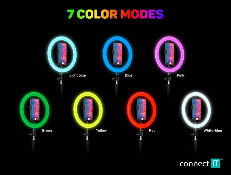 Kruhové selfie LED světlo "Selfie10RGB" s flexibilním držákem na mobilní telefon, stativem s kulovou hlavou a dálkovým ovládáním pro domácí i profesionální použití umožňuje nastavit 7 statických barev, 8 dynamických efektů a barevnou teplotu světla ve 3 různých úrovních (3200/4300/5500 K).