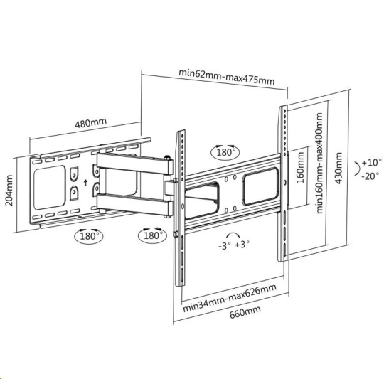 • Rozměry držáku (š x v x h): 660 x 430 x 62~475 mm
