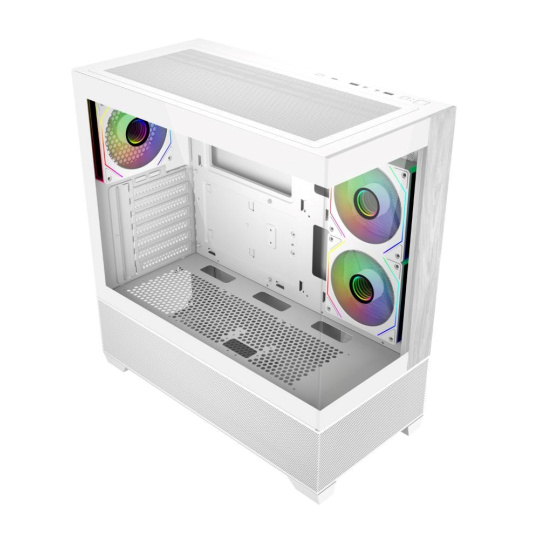 Model Elite 690 má čistý a moderní design a je vybaven dvěma panely z tvrzeného skla na přední a boční straně, které prezentují prémiové komponenty a osvětlení RGB. Přední panel kombinuje přírodní akcent s texturou dřeva se spodním sáním ze síťoviny, což přináší jak estetické teplo, tak efektivní proudění vzduchu. Díky rozsáhlému větrání na horní a spodní straně podporuje skříň univerzální konfigurace ventilátorů a chladičů, které umožňují výkonné vertikální chlazení. Ať už stavíte vysoce výkonnou předváděcí sestavu nebo stylovou stolní sestavu, Elite 690 poskytuje dokonalou rovnováhu mezi funkčností a formou.