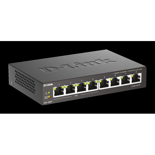 8-port 10/100/1000 Desktop Switch w/ 4 PoE+ Ports - 8-Port 10000BaseTX Auto-Negotiating (NWAY) 10/100/1000Mbps - IEEE 802.3at standard compliant - Includes 4 PoE ports (Ports 1-4) - Auto Half-/Full-Duplex Mode - PoE output up to 30 watts per port - Total power budget 68 watts per switch - Auto-detection of Powered Device - Supports 802.1p QoS and DSCP - Supports Jumbo Frame up to 9720Bytes - Supports cable diagnostics - D-Link Green Technology - 53.5V/1.5A external power supply - Desktop size (No rackmount kit available).