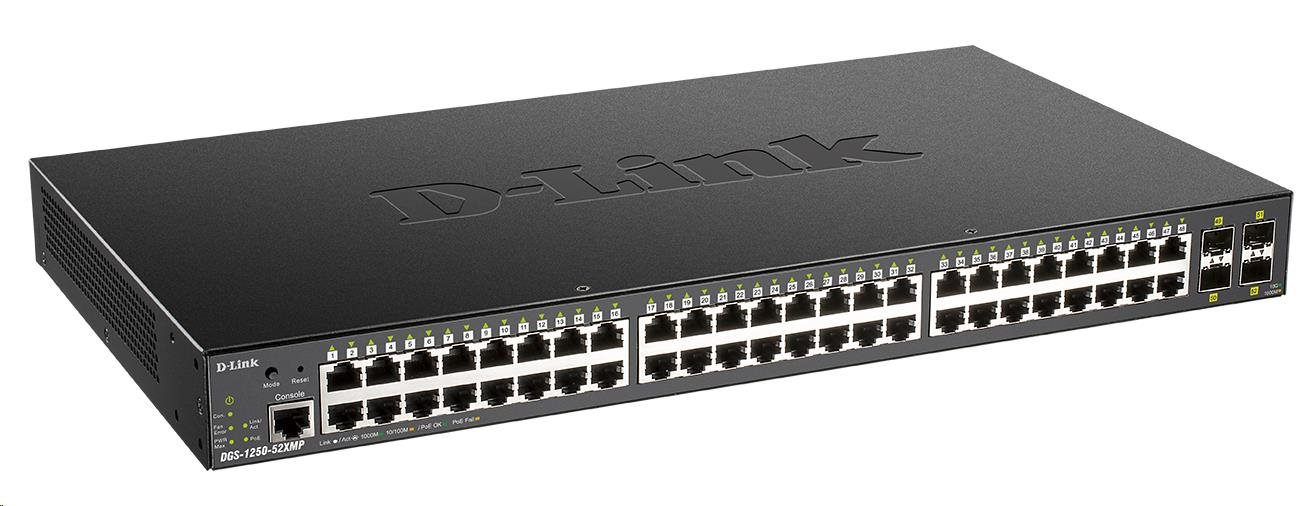 D-Link DGS-1250-52XMP 52-Port Gigabit Smart PoE Switch, 48x GbE PoE+, 4x SFP+, PoE 370W