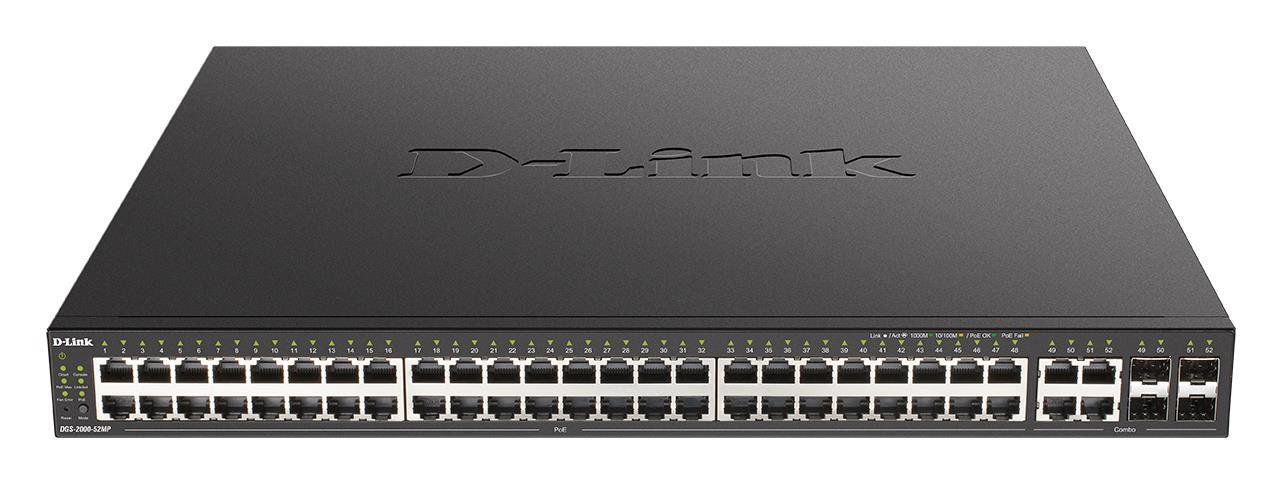 D-Link DGS-2000-52MP je plně řízený 52-portový Gigabit Managed PoE switch pro podnikové sítě. Přepínač je osazen 48 porty 10/100/1000M RJ-45 s podporou napájení 802.3at PoE+ (max. 30W na port) a čtyřmi kombinovanými Gigabit Combo porty RJ-45/SFP, s podporou 100M a 1000M SFP (Mini-GBIC) transceiverů pro optický uplink. Celkový PoE výkon přepínače je 370W. Aktivní chlazení přepínače zajišťují tři inteligentně řízené ventilátory. Součástí dodávky jsou držáky pro montáž do 19“ rozvaděče. Switche D-Link řady DGS-2000 nabízí komplexní sadu L2 funkcí, bezpečnostní funkce, funkce kvality služeb (QoS) a základní L3 funkce (max. 4 IP Interfaces, statický routing s max. 128 IPv4/IPv6 záznamy, default route, IPv6 Neighbor Discovery). Řešení případných potíží v sítí usnadňují funkce 802.3ah OAM, diagnostika kabelů a detekce jednosměrné linky (D-Link Unidirectional Link Detection, DULD). ISP poskytovatelé internetu ocení funkce Q-in-Q (Port Based), Multicast VLAN (ISM VLAN) nebo IGMP Authentication / Filtering pro efektivní provoz IPTV služeb. Správa přepínače je přes webové rozhraní, CLI sériovou konzoli, Telnet, SLL, SSH nebo pomocí SNMP příkazů. Pro prvotní konfiguraci a základní správu je k dispozici bezplatný SW nástroj a mobilní aplikace D-Link Network Assistant (DNA), pro centrální správu rozsáhlejších sítí je určena pokročilá platforma D-View 7..