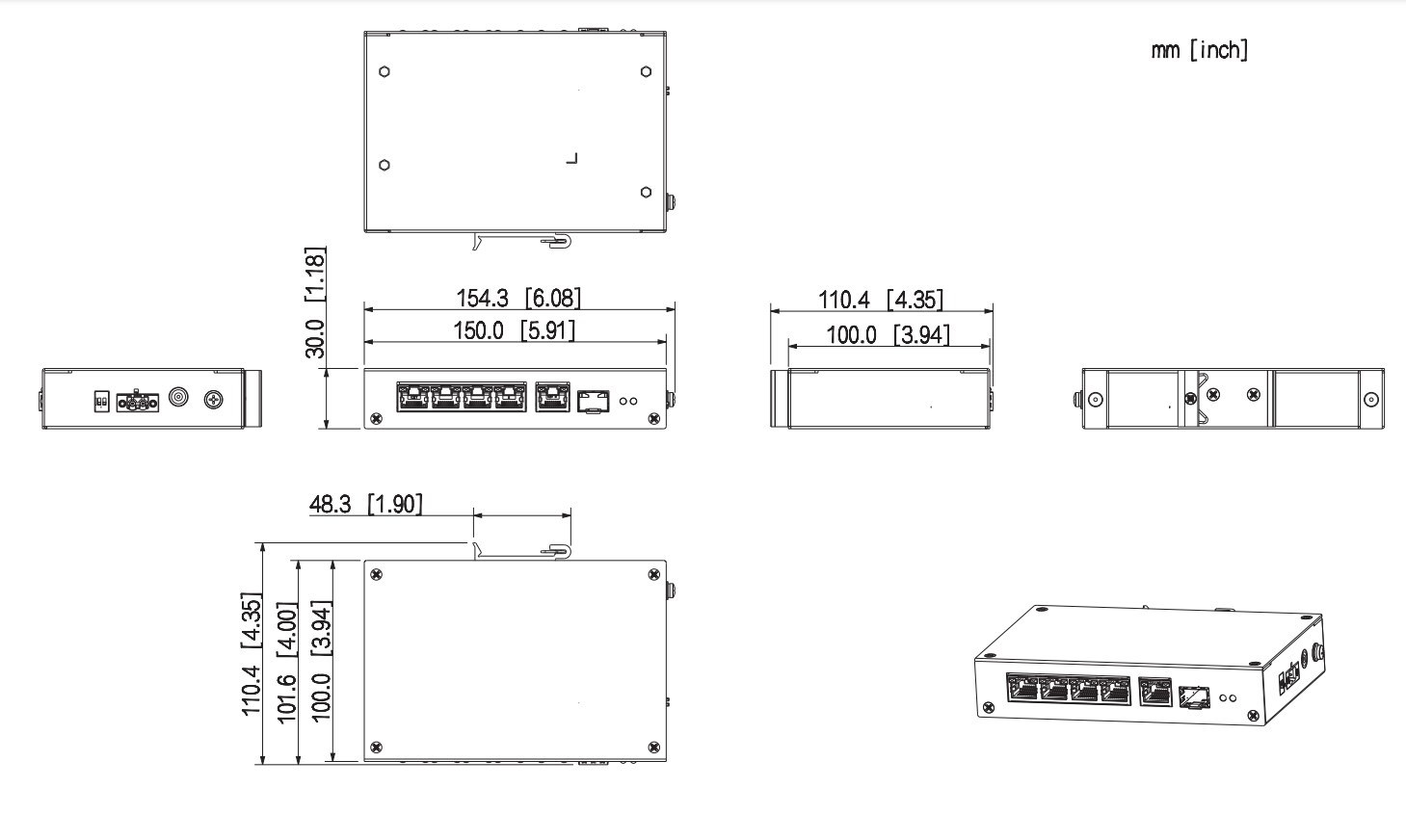 - Port pro přenos dat: Port 1–4: 4 × RJ-45 10/100 Mbps (PoE); Port 5: 1 × RJ-45 10/100/1000 Mbps (Uplink); Port 6: 1 × SFP 100/1000 Mbps (Uplink)