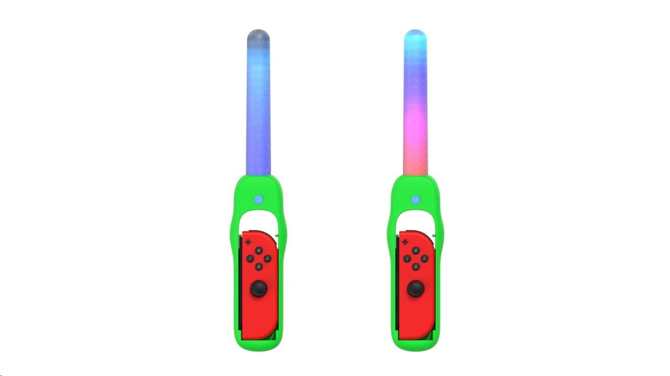 Dance ‘N’ Play Kit obsahuje 2x svíticí tyčinky LED citlivé na zvuk, s růžovým a zeleným úchytem a zápěstními řemínky. Svíticí tyčinky LED citlivé na zvuk s vícebarevným efektem duhového podsvícení budou fungovat, pulzovat, zářit a tančit podle jakéhokoliv zvuku. Ať už půjde o hudbu, nebo zvuky ze hry, Dance ‘N’ Play Kit prozáří váš pokoj.