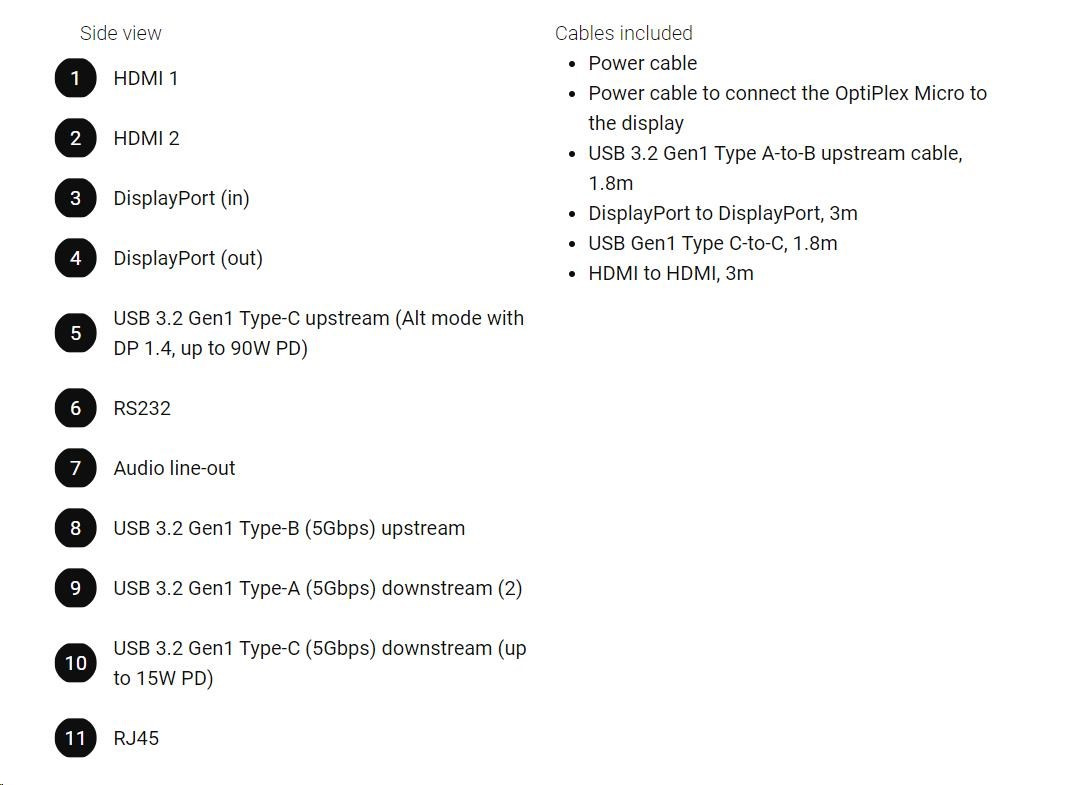| Power cable ? Power cable to connect the OptiPlex Micro to the display ? USB 3.2 Gen1 Type A-to-B upstream cable, 1.8m ? DisplayPort to DisplayPort, 3m ? USB Gen1 Type C-to-C, 1.8m ? HDMI to HDMI, 3m |
